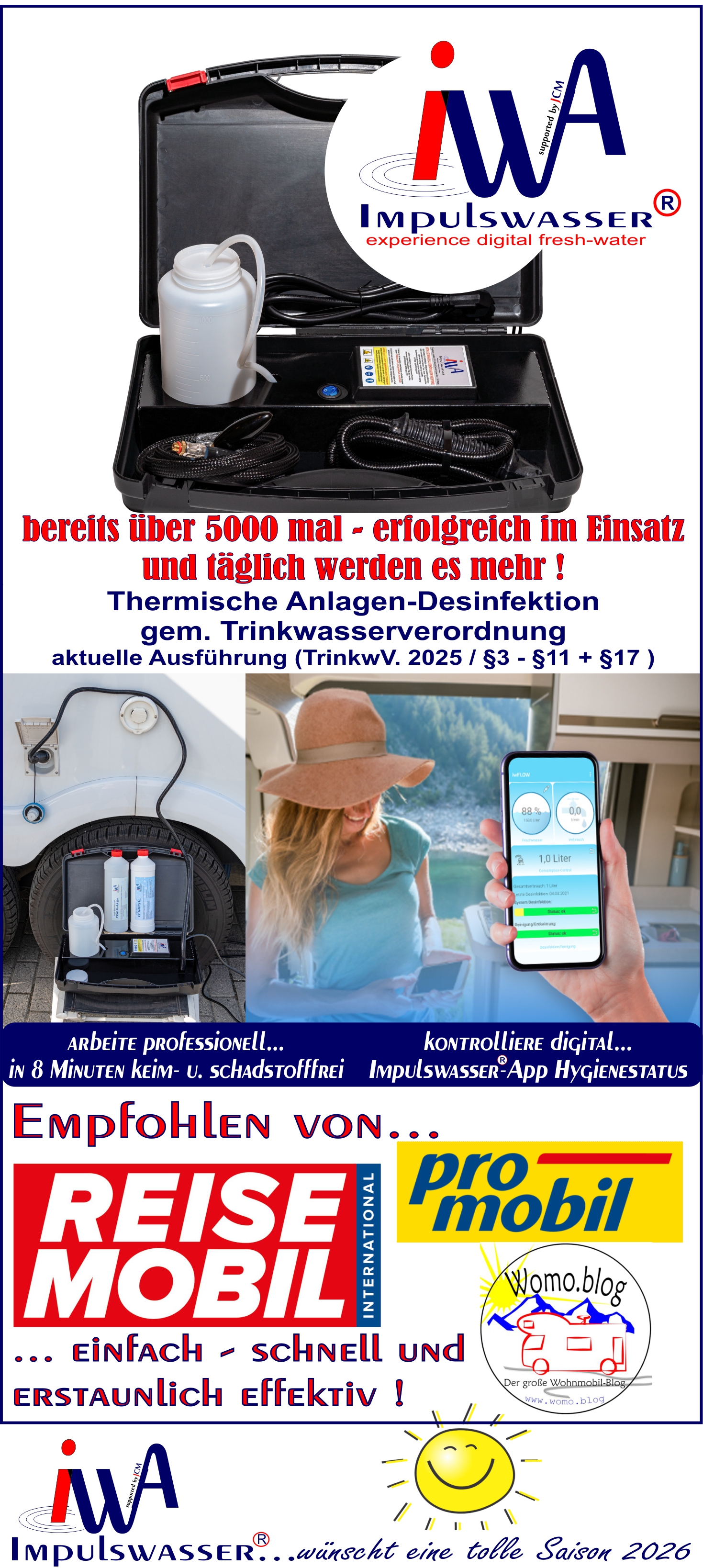 Wasseranlagen-Voll-Desinfektion in nur 8 Minuten, (entleert) ohne Wasser im Tank !